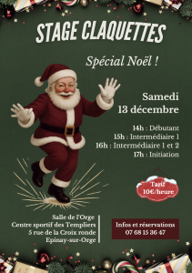 Venez vivre un après-midi rythmé et festif avec le stage de claquette spécial Noël de l'association VIROCLAQ à la salle de l'Orge. 14h : débutants 15h : intermédiaire 1 16h : intermédiaire 1 & 2 17h : initiation Tarif : 10h/h. Réservez vite au 07 68 15 36 47 et laissez-vous emporter par la magie du rythme.