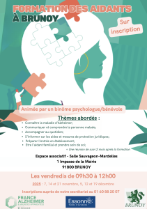 Il reste quelques places pour la formation des aidants à Brunoy Vous accompagnez un proche atteint de la maladie d’Alzheimer ou d’une maladie apparentée ?Une formation des aidants débutera à Brunoy à partir du 7 novembre, et il reste encore quelques places disponibles. Cette formation a pour objectif d’apporter aux aidants des informations essentielles sur la maladie, ainsi que des outils pratiques pour mieux comprendre la personne accompagnée et adapter son soutien au quotidien.
